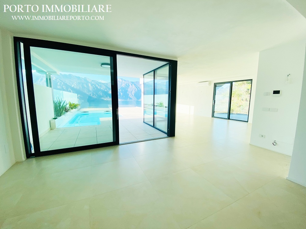 angolo cottura e zona pranzo con uscita nella stupenda terrazza con piscina privata in strepitosa vista lago